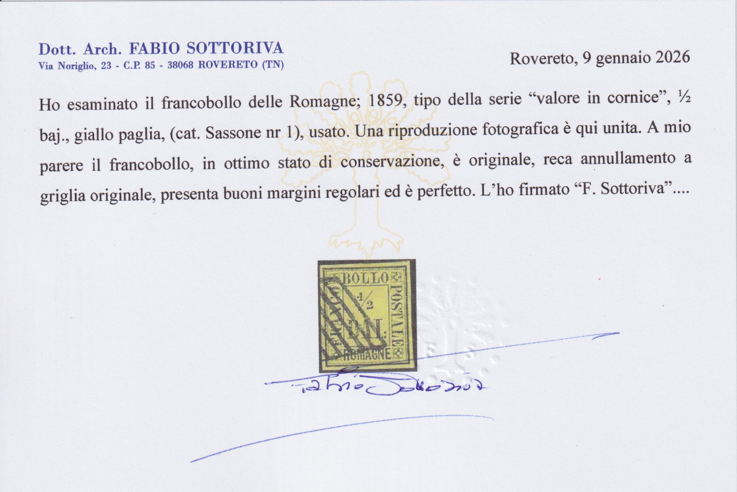 1859 ROMAGNE 1/2 BAJ “VALORE IN CORNICE” CERT. SOTTORIVA