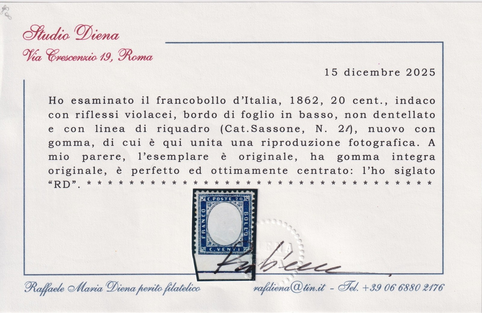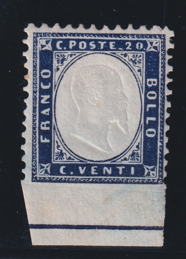 1862 Italia Regno cent. 20 indaco M.N.H. CERT. DIENA
