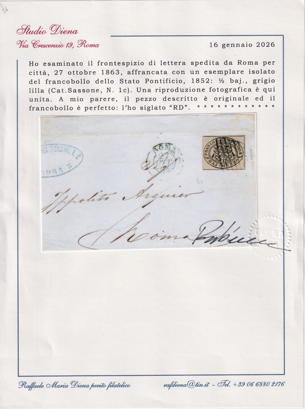/ 1863 FRONTESPIZIO STATO PONTIFICIO Sass. 1c CERTIFICATO DIENA