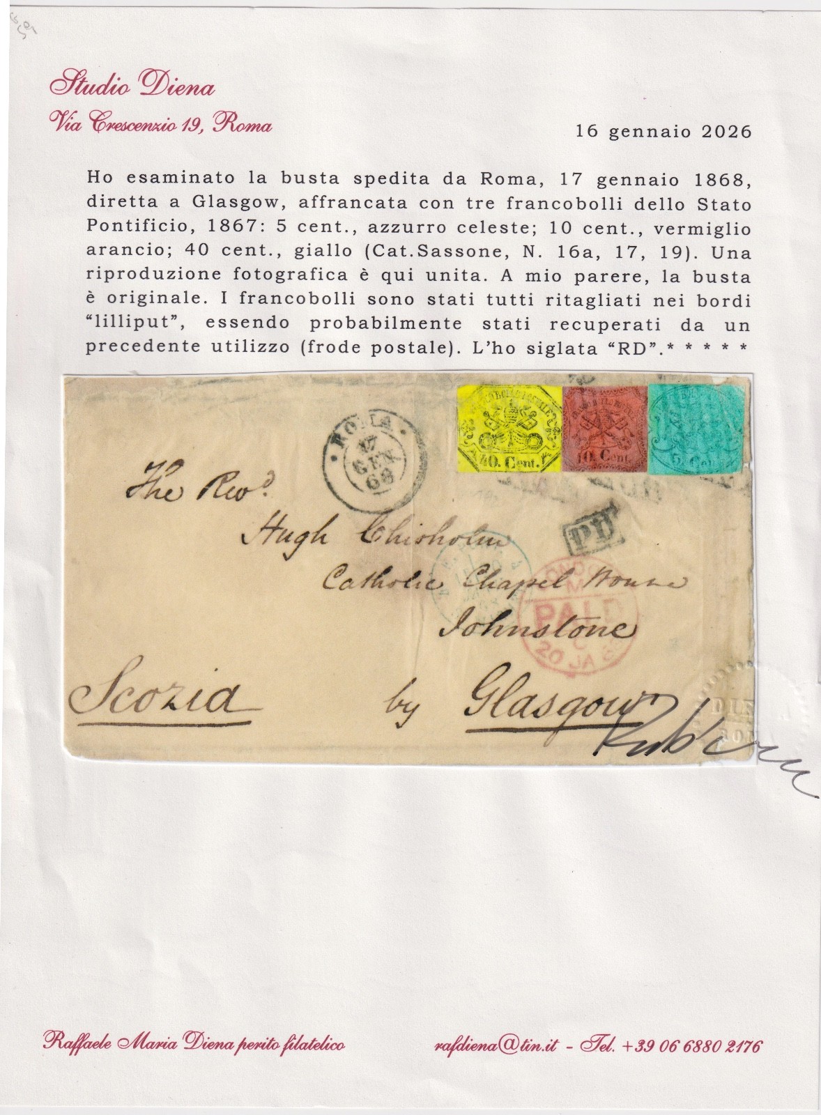 1868 STATO PONTIFICIO LETTERA "FRODE POSTALE" CERTIFICATO DIENA quantità