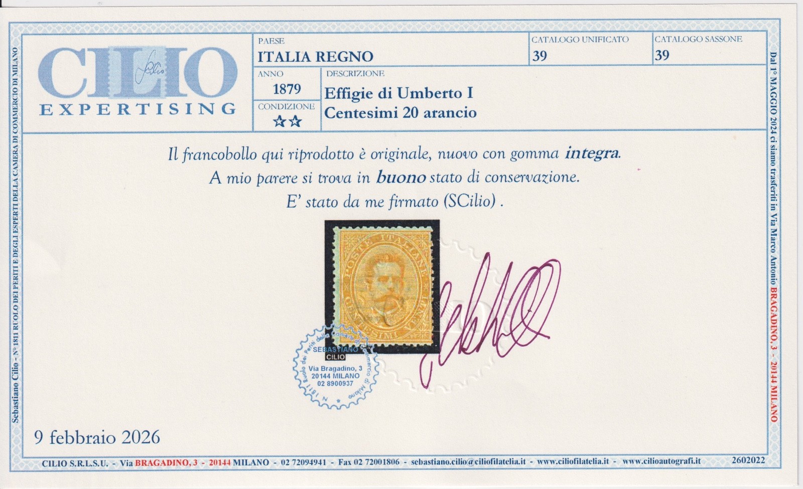 / 1879 Regno d’Italia Effigie Umberto I° 20 c. MNH Sass. 39 – Certificato Cilio