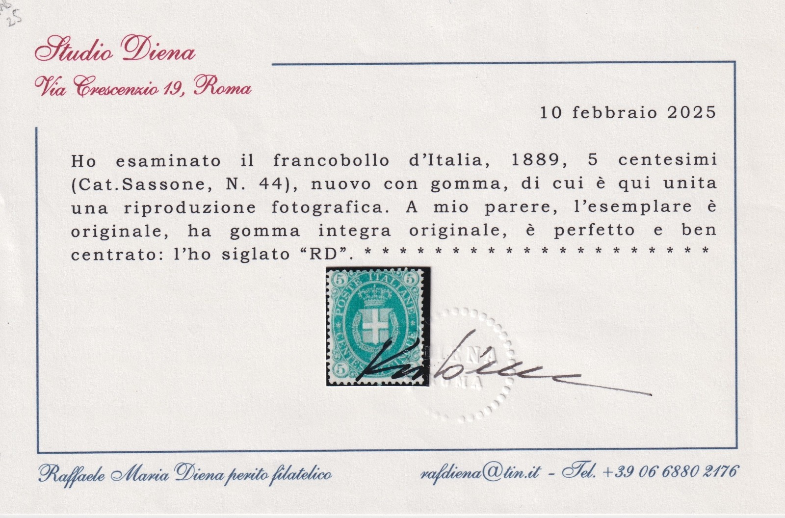 1889 UMBERTO I 5 CENT. STEMMA SAVOIA MNH CERTIFICATO DIENA quantità