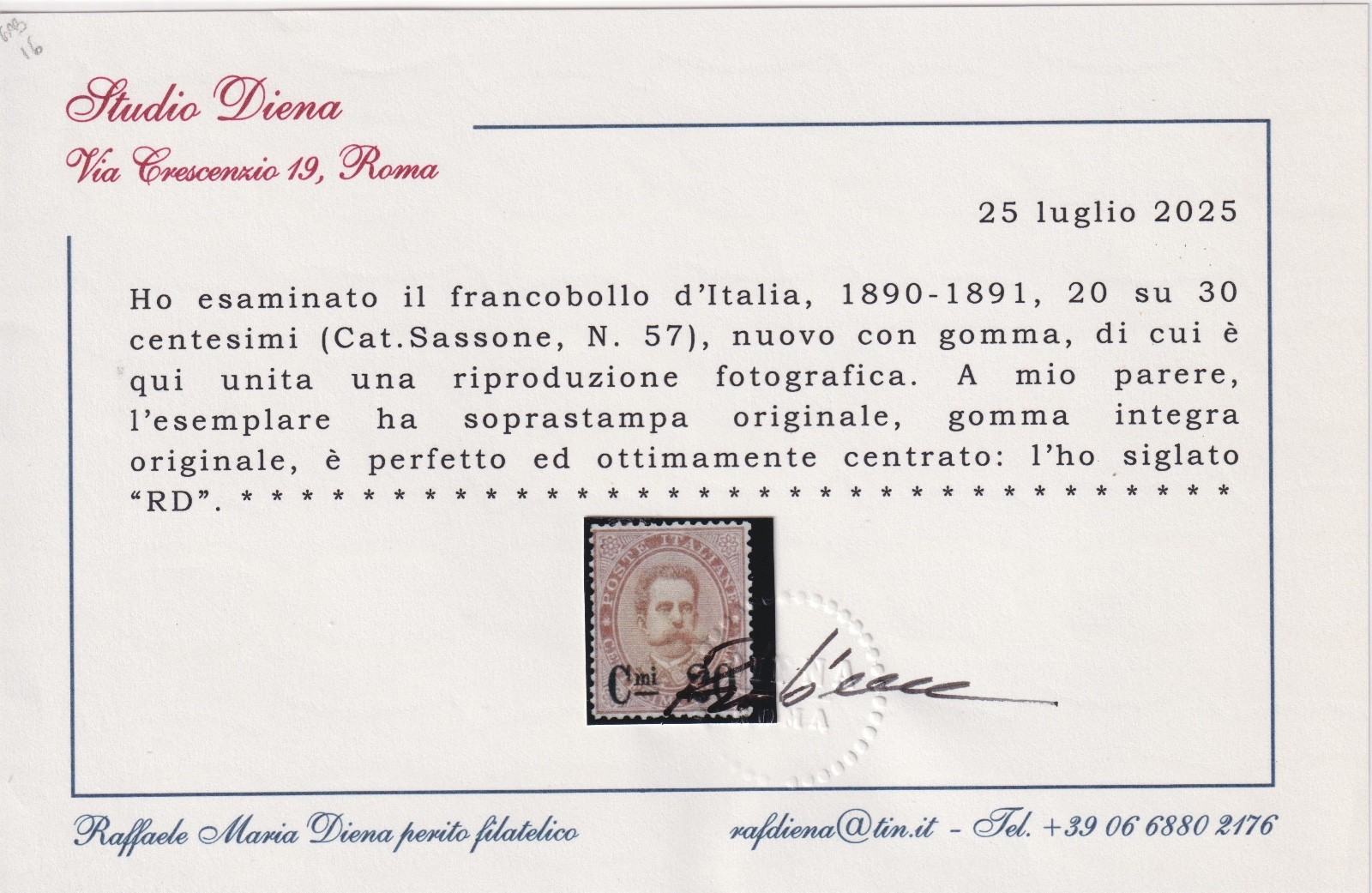 1890-91 REGNO UMBERTO I SOVRASTAMPATO 20 SU 30c. MNH CERTIFICATO DIENA quantità