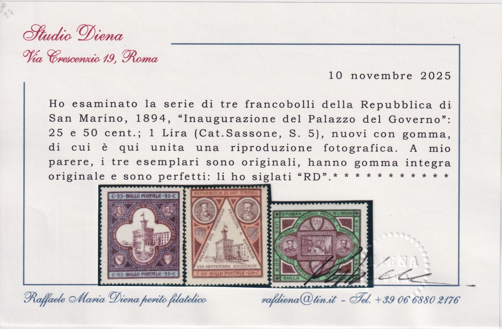 1894 S. MARINO "Inaugurazione Palazzo del Governo" MNH CERT. DIENA quantità