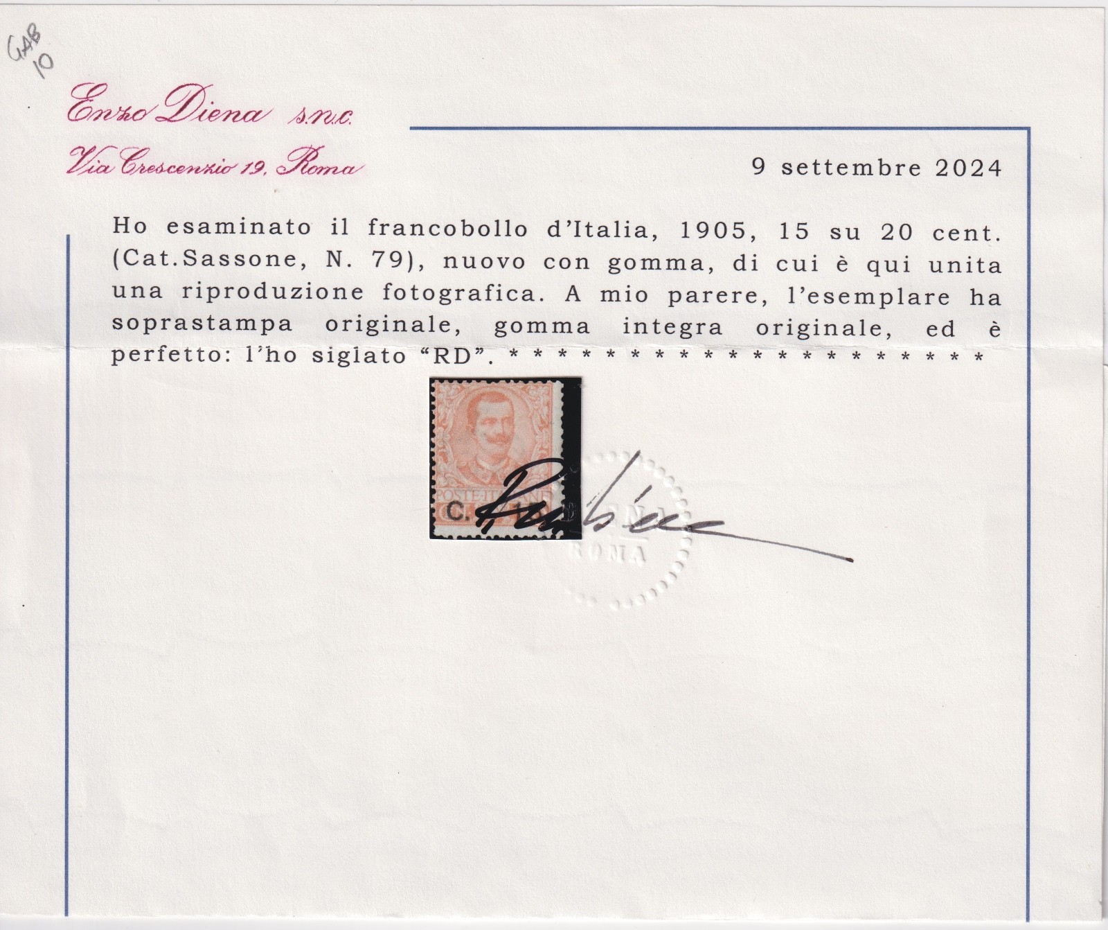 1905 REGNO D’ ITALIA VITTORIO EMANUELE III 15 C. Su 20 C. MNH CERTIFICATO DIENA quantità