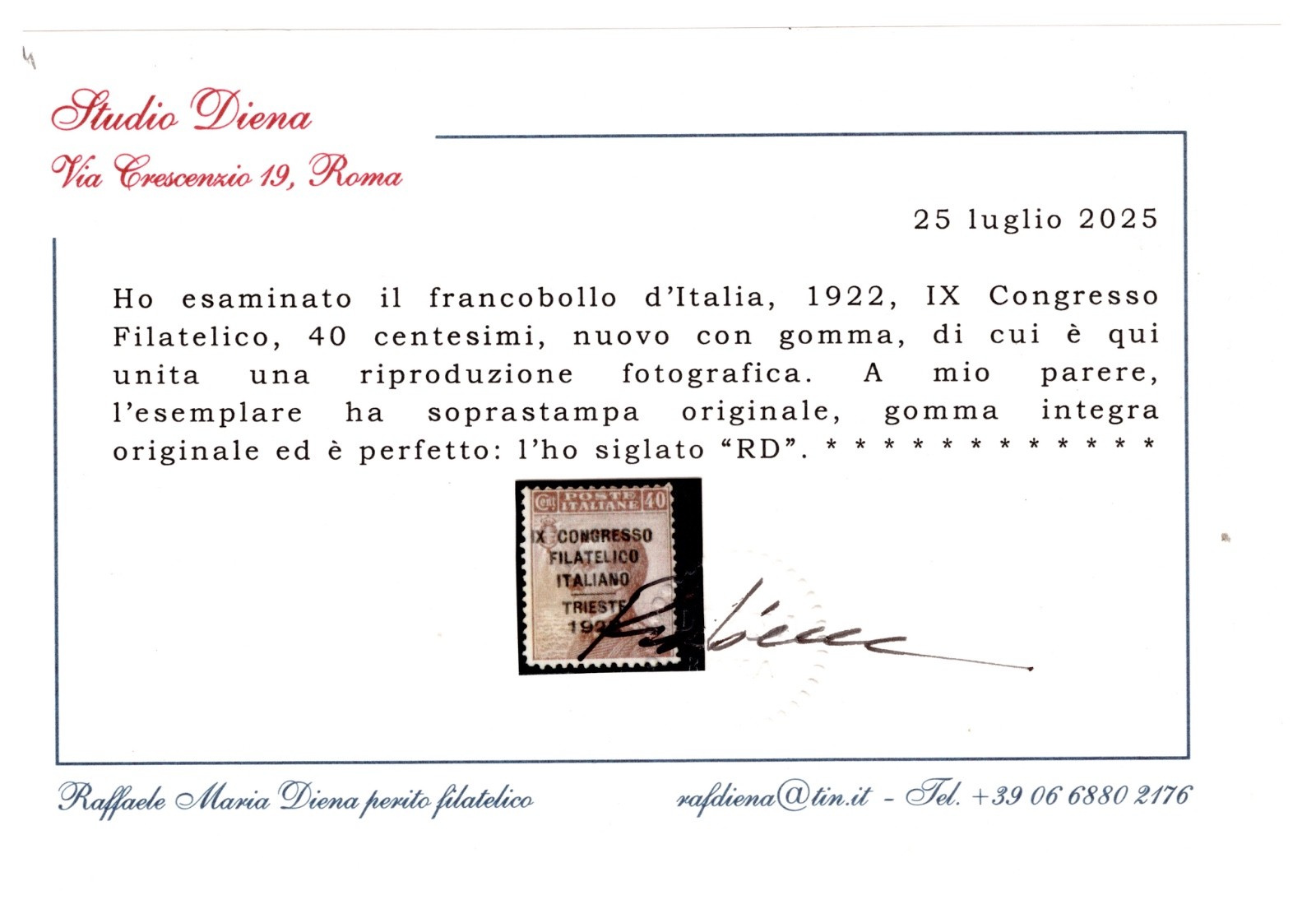 REGNO 1928 – Stemma d’Italia e fascio RECAPITO AUTORIZZATO MNH CERTIFICATO DIENA