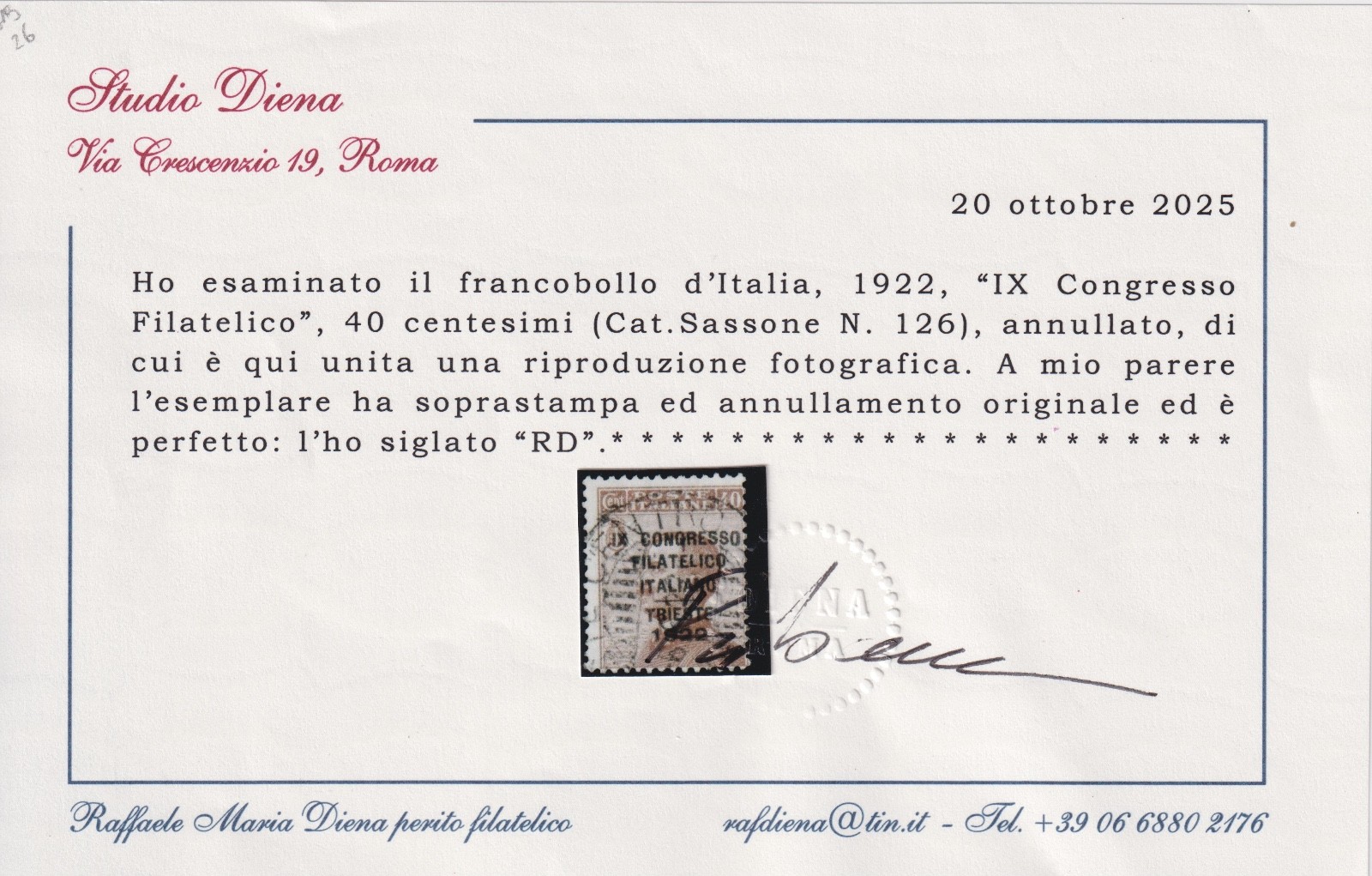 / 1922 IX CONGRESSO FILATELICO 40 CENT. Sass. 126 CERT. DIENA