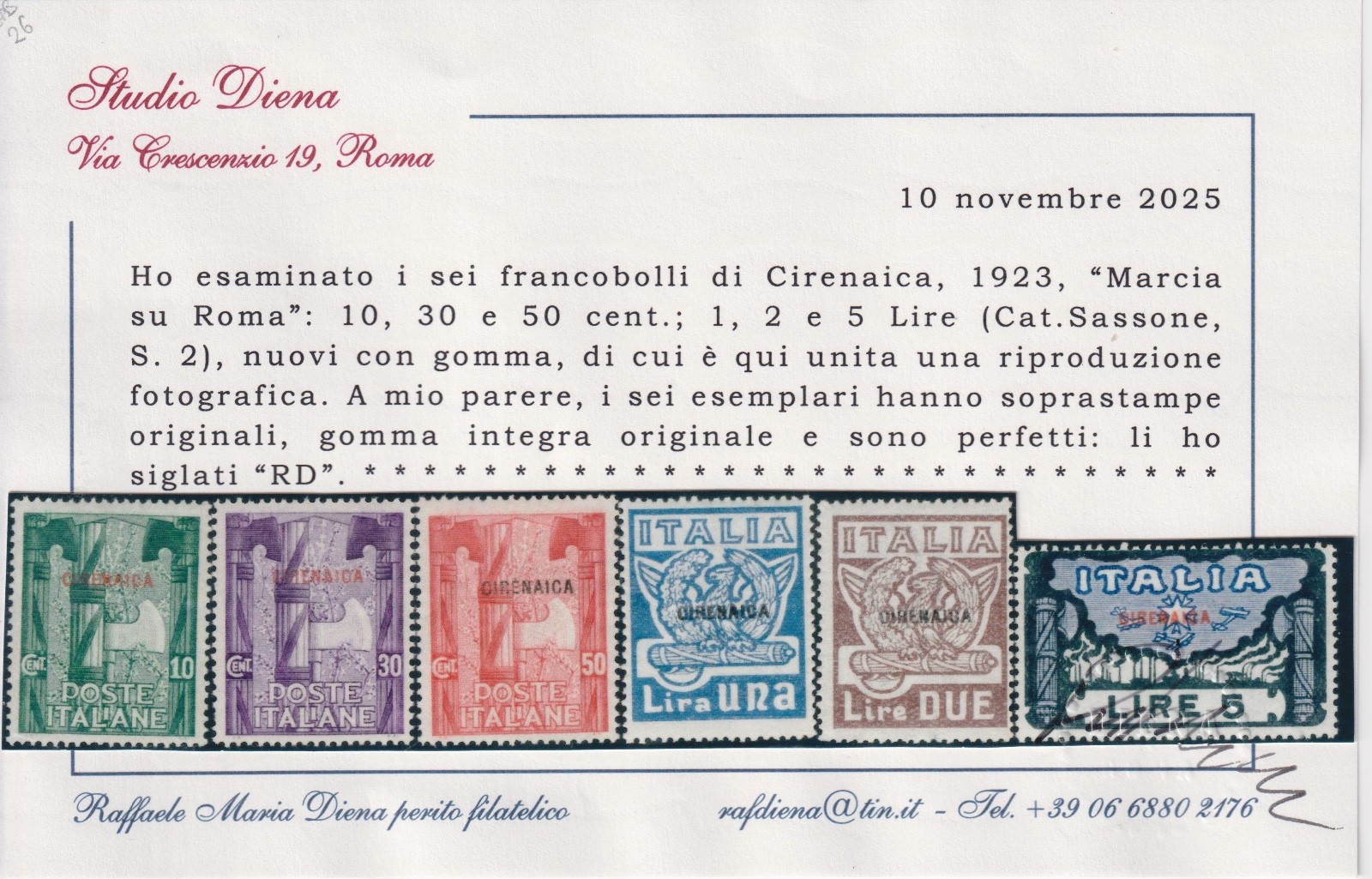 1923 CIRENAICA MARCIA SU ROMA 6 FRANCOBOLLI MNH CERTIFICATO DIENA quantità
