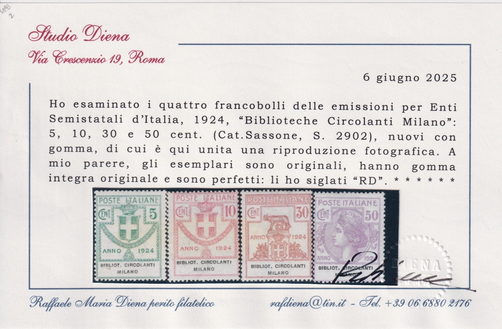 1924 ENTI SEMISTATALI BIBLIOTECHE CIRCOLANTI MILANO MNH CERTIFICATI DIENA quantità
