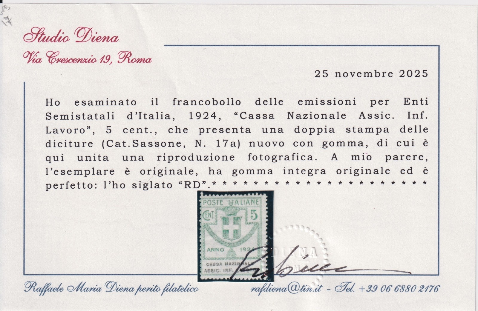 1924 Italia Enti Semistatali CASSA NAZIONALE ASSIC. INF. LAVORO MNH CERT. DIENA quantità