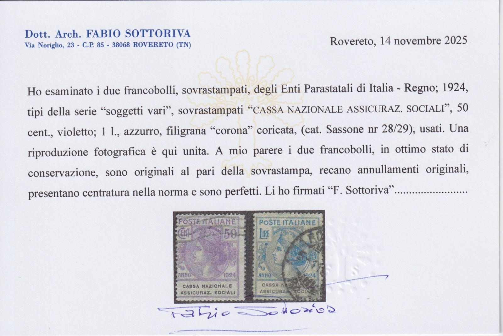 REGNO 1928 – Stemma d’Italia e fascio RECAPITO AUTORIZZATO MNH CERTIFICATO DIENA