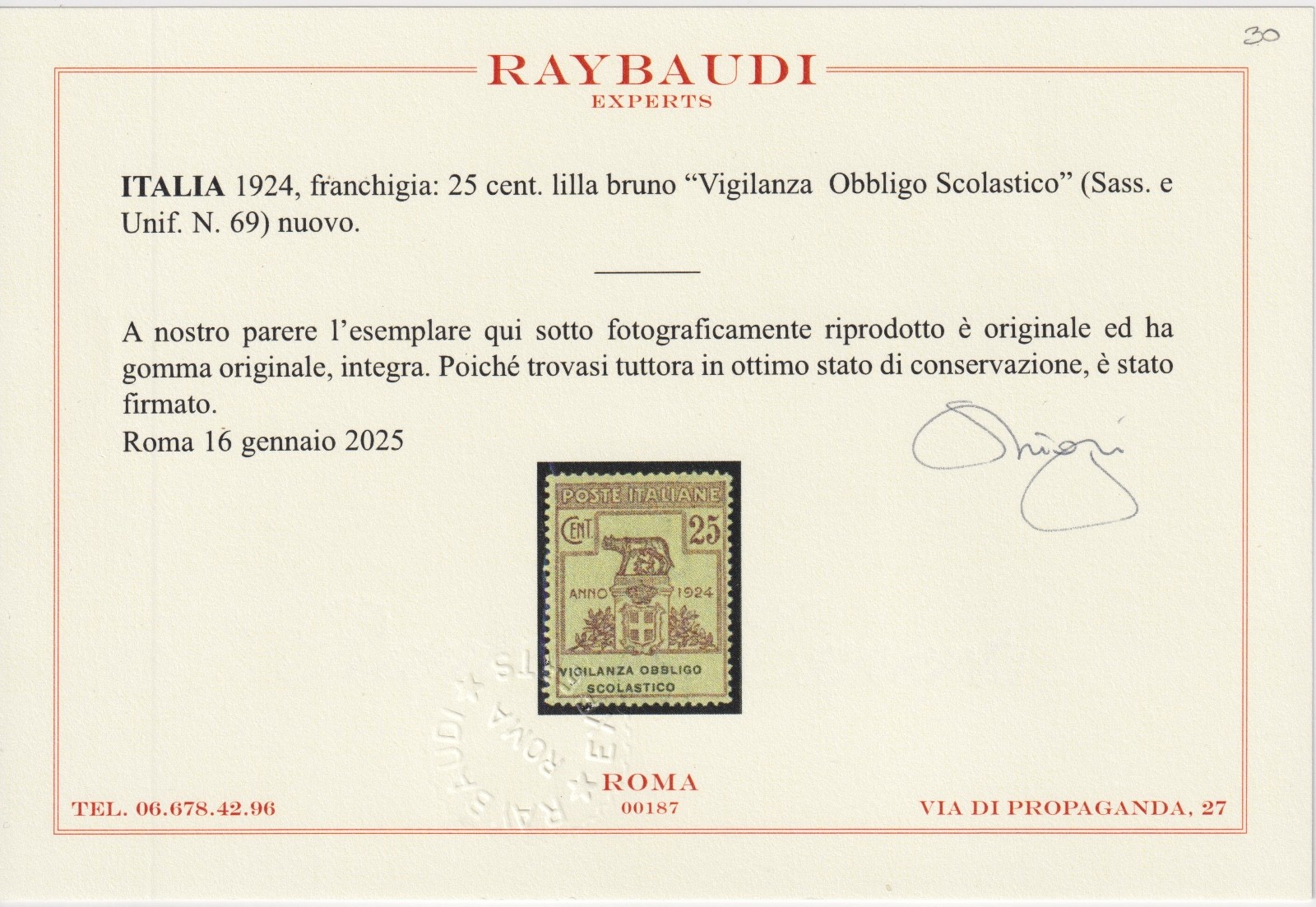 / 1924 REGNO ENTI SEMISTATALI VIGILANZA OBBLIGO SCOLASTICO MNH CERT. RAYBAUDI