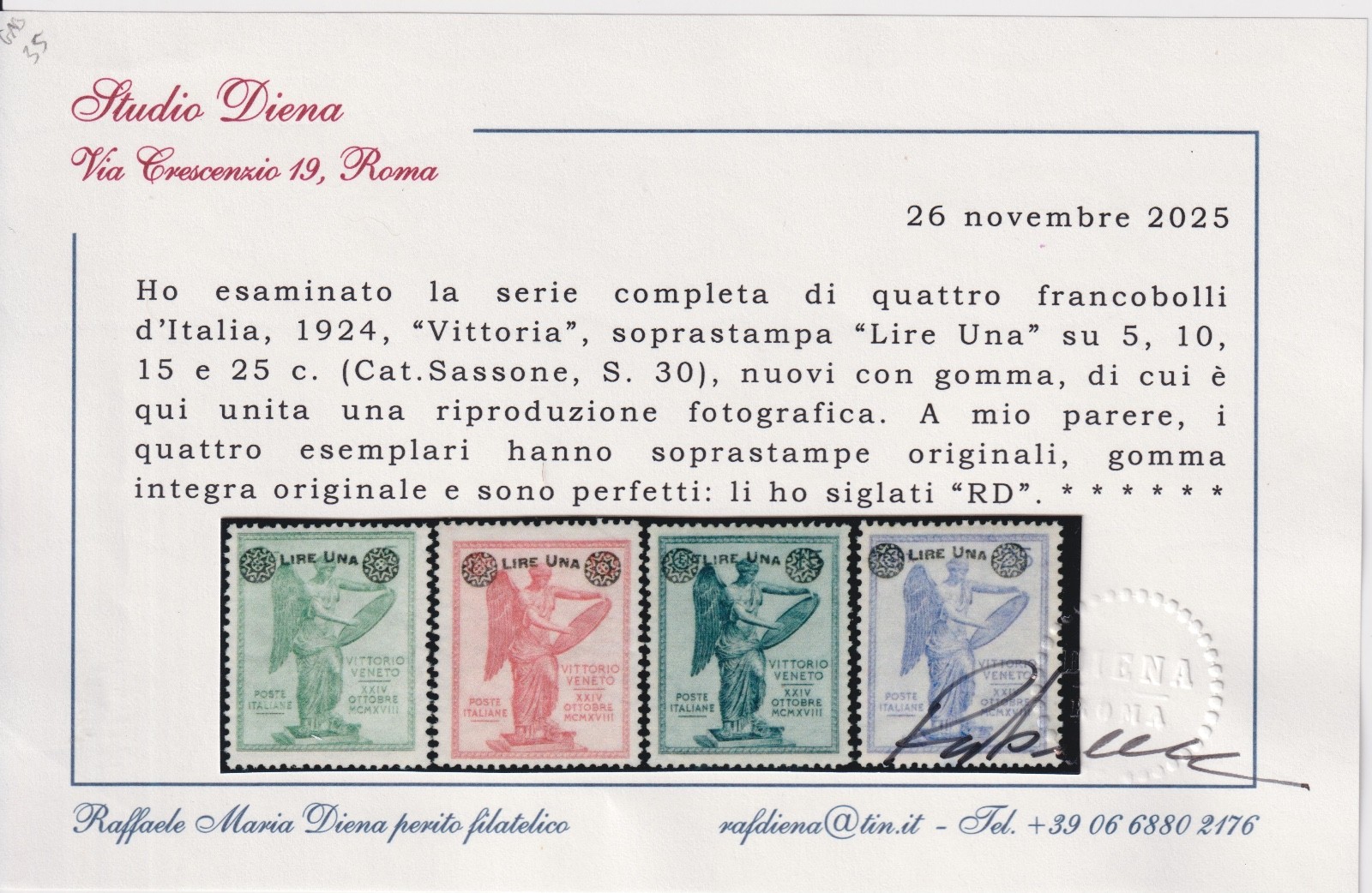 1924 REGNO VITTORIA SOVRASTAMPATA 1 LIRA 4 VAL. MNH CERTIFICATO DIENA quantità