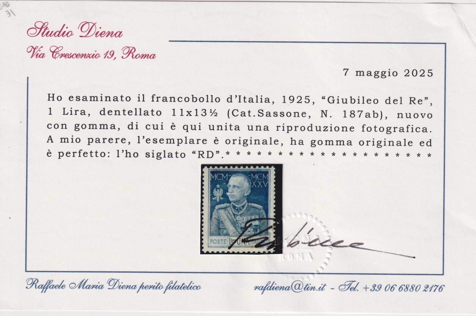 1925 GIUBILEO DEL RE 1 LIRA DENT. 11X13 ½ MNH CERTIFICATO DIENA quantità