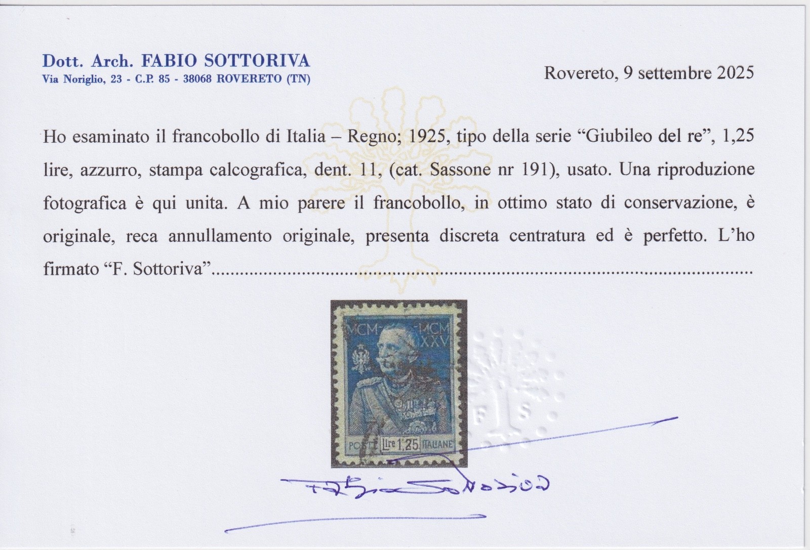 / 1925 GIUBILEO DEL RE LIRE 1.25 AZZURRO DENT.11 CERTIFICATO SOTTORIVA
