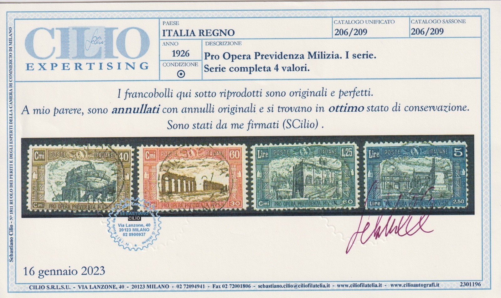 1926 PRO OPERA PREVIDENZA MILIZIA I° TIPO – SERIE COMPLETA CERTIFICATA CILIO