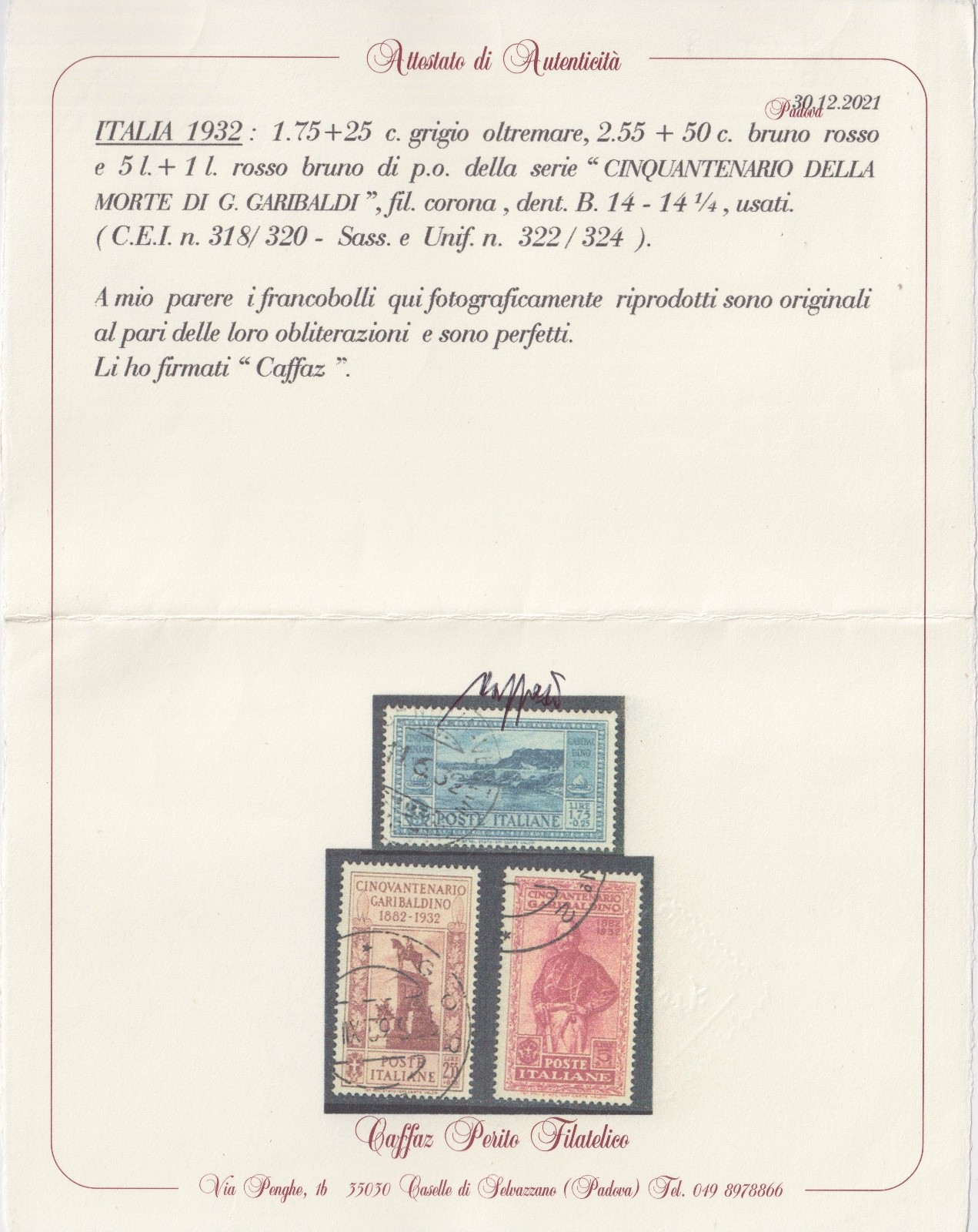 1932 CINQUANTENARIO DELLA MORTE DI G. GARIBALDI P.A. CERTIFICATO CAFFAZ quantità