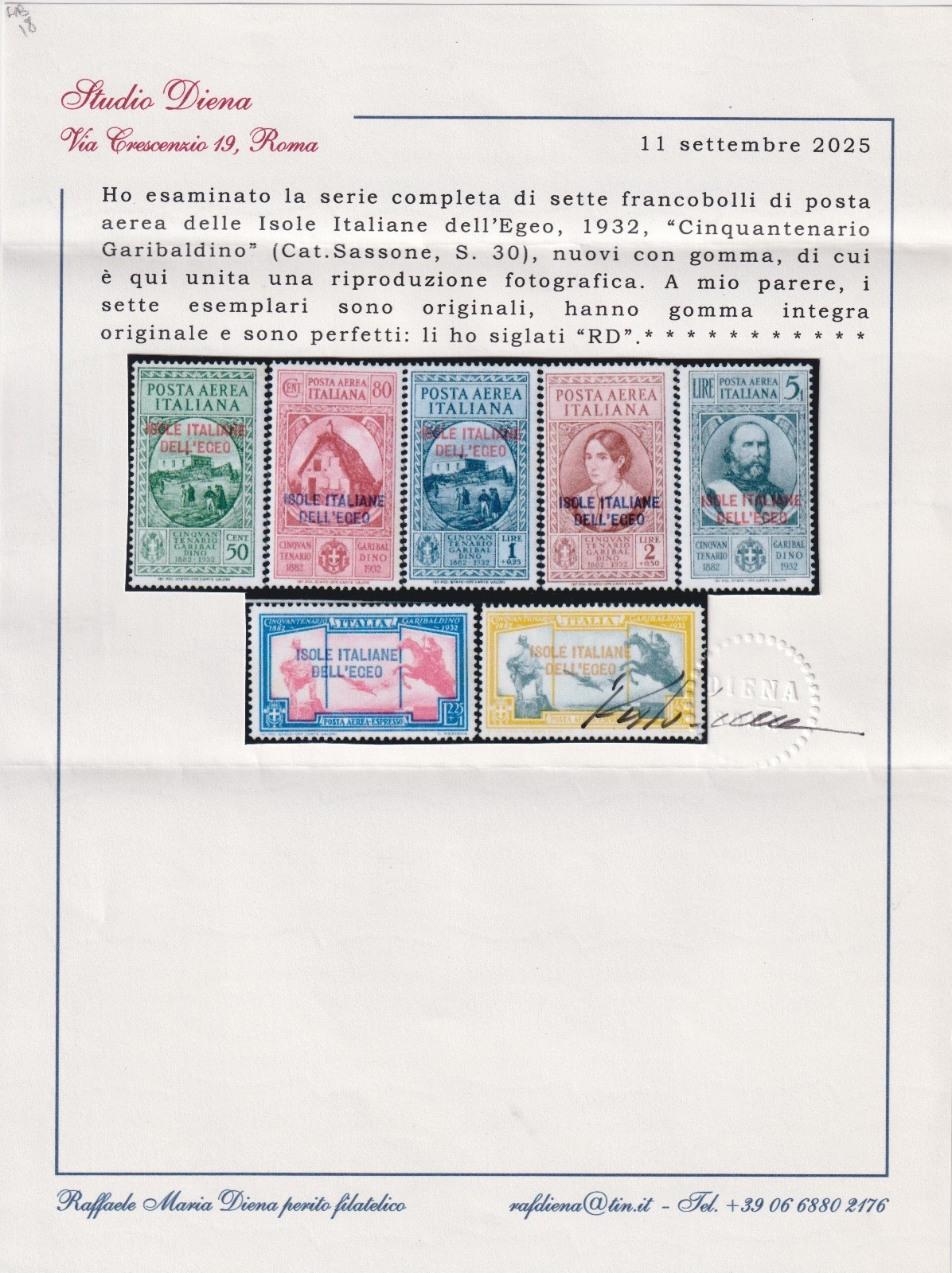 1932 ISOLE EGEO CINQUANTENARIO GARIBALDINO P.A. MNH CERT. DIENA - SERIE COMPLETA quantità