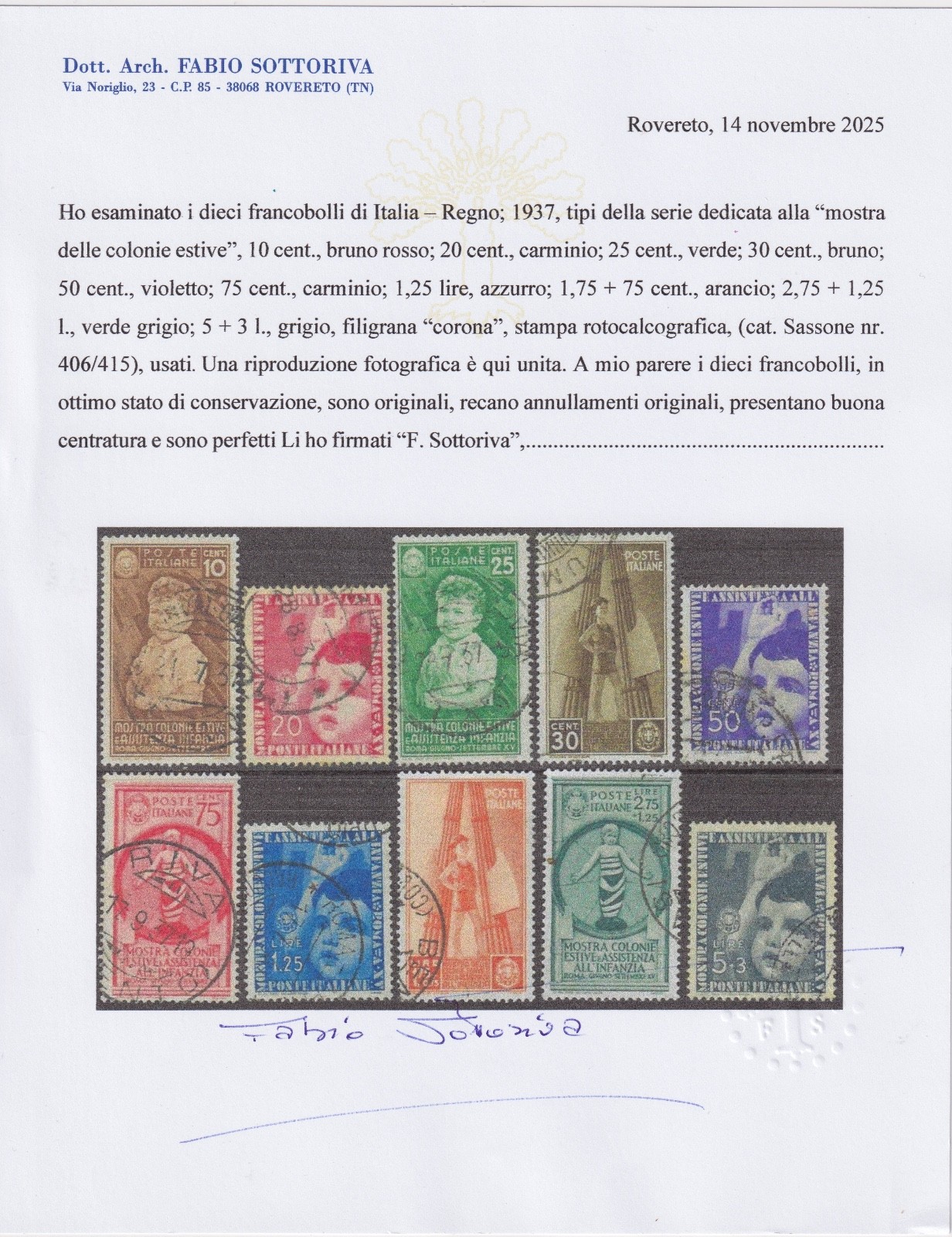 1937 ITALIA MOSTRA COLONIE ESTIVE 10 VALORI CERTIFICATO SOTTORIVA quantità