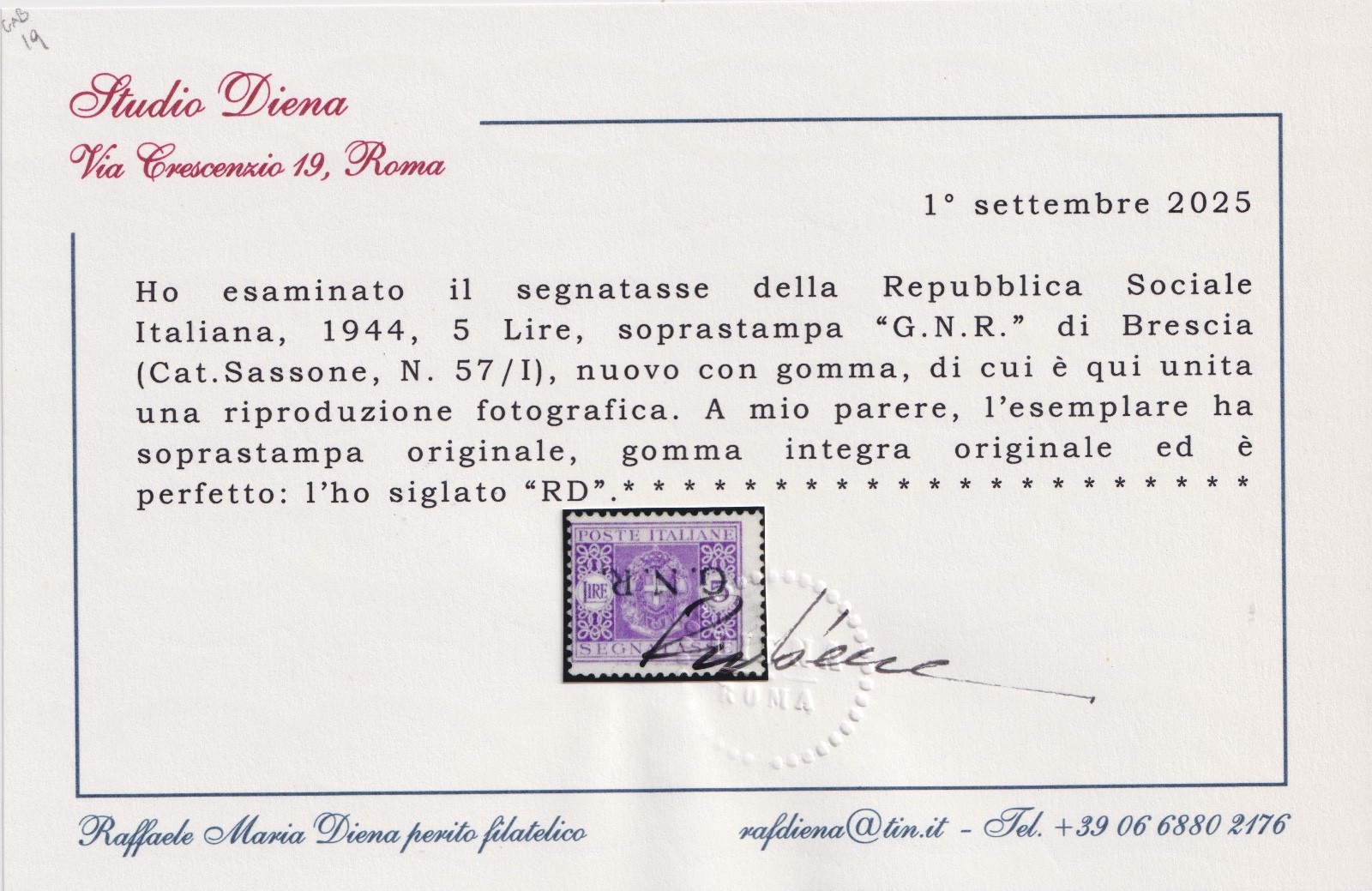 1944 G.N.R. REPUBBLICA SOCIALE ITALIANA SEGNATASSE 5 LIRE MNH CERTIFICATO DIENA quantità