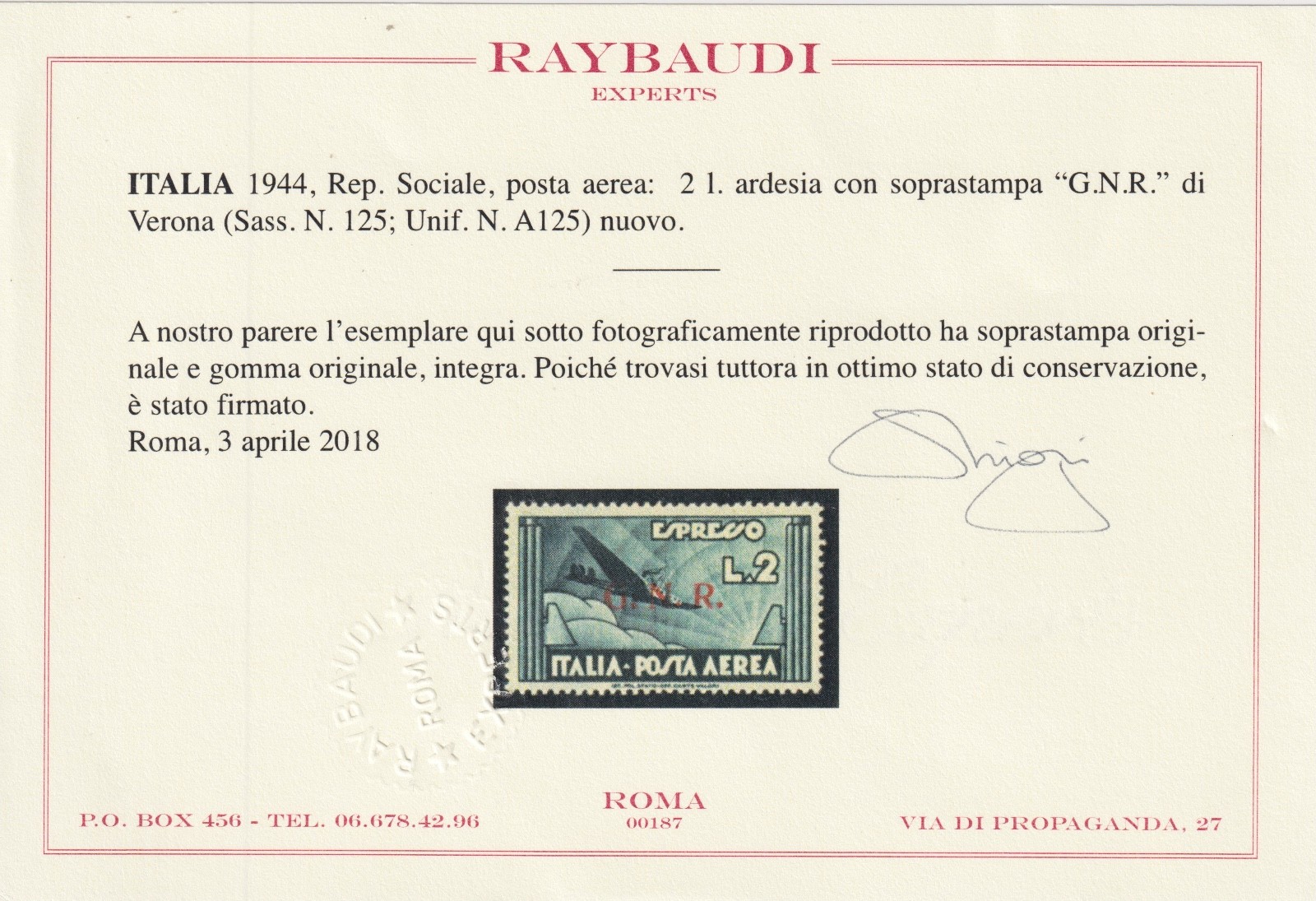 / 1944 REPUBBLICA SOCIALE GNR DI VERONA 2 LIRE ARDESIA P.A. MNH CERT. RAYBAUDI