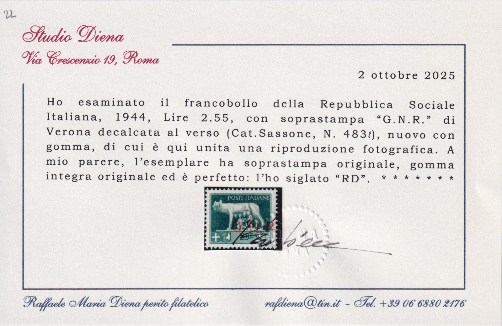1944 REPUBBLICA SOCIALE ITALIANA G.N.R. DI VERONA MNH CERT. DIENA