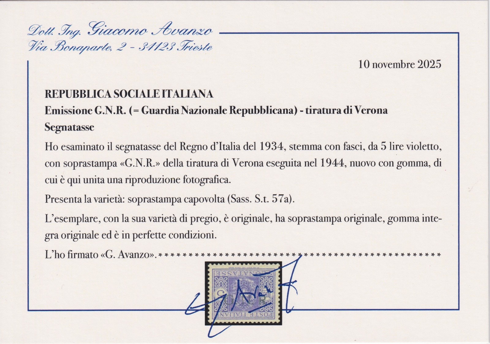 1944 SEGNATASSE REPUBBLICA SOCIALE ITALIANA G.N.R. MNH CERTIFICATO DIENA