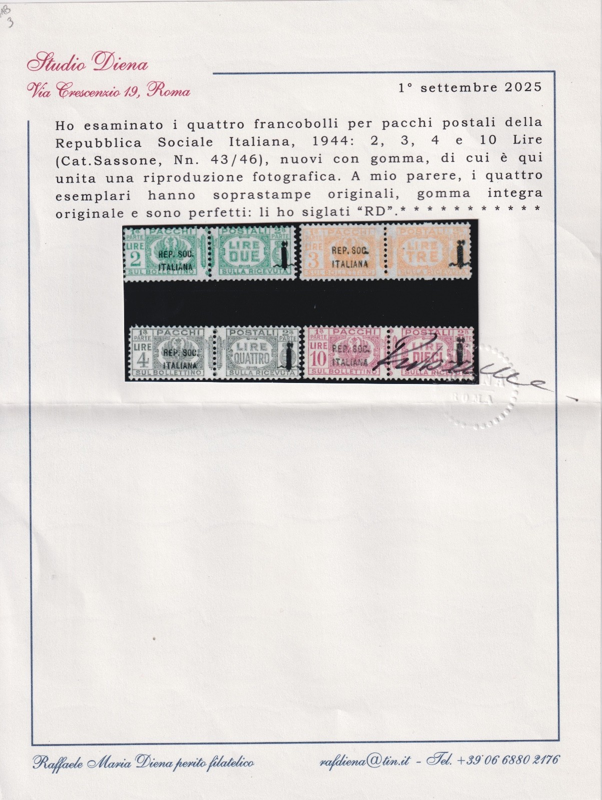 1944 REPUBBLICA SOCIALE ITALIANA PACCHI POSTALI SERIETTA MNH CERTIFICATO DIENA quantità