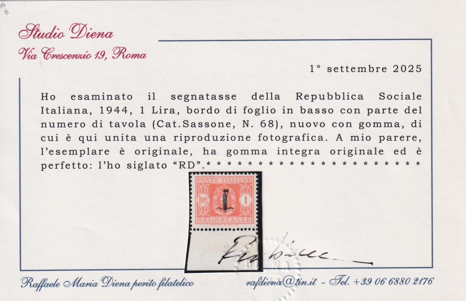 1944 REPUBBLICA SOCIALE ITALIANA SEGNATASSE 1 L. MNH CERT. DIENA
