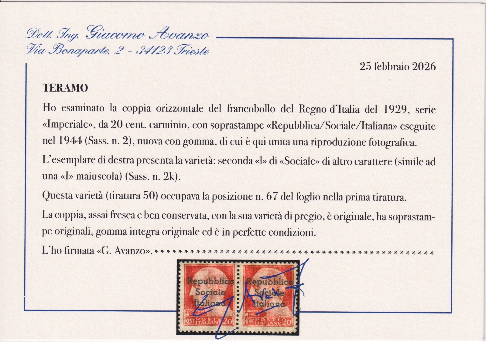 1944 REPUBBLICA SOCIALE ITALIANA VARIETÀ CENT. 20 M.N.H. CERTIFICATO AVANZO quantità