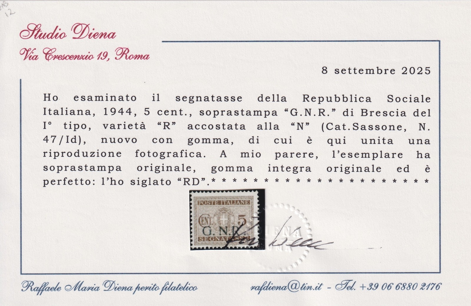 / 1944 Repubblica Sociale (RSI) – Segnatasse GNR 5 CENT. MNH CERT. DIENA RARO