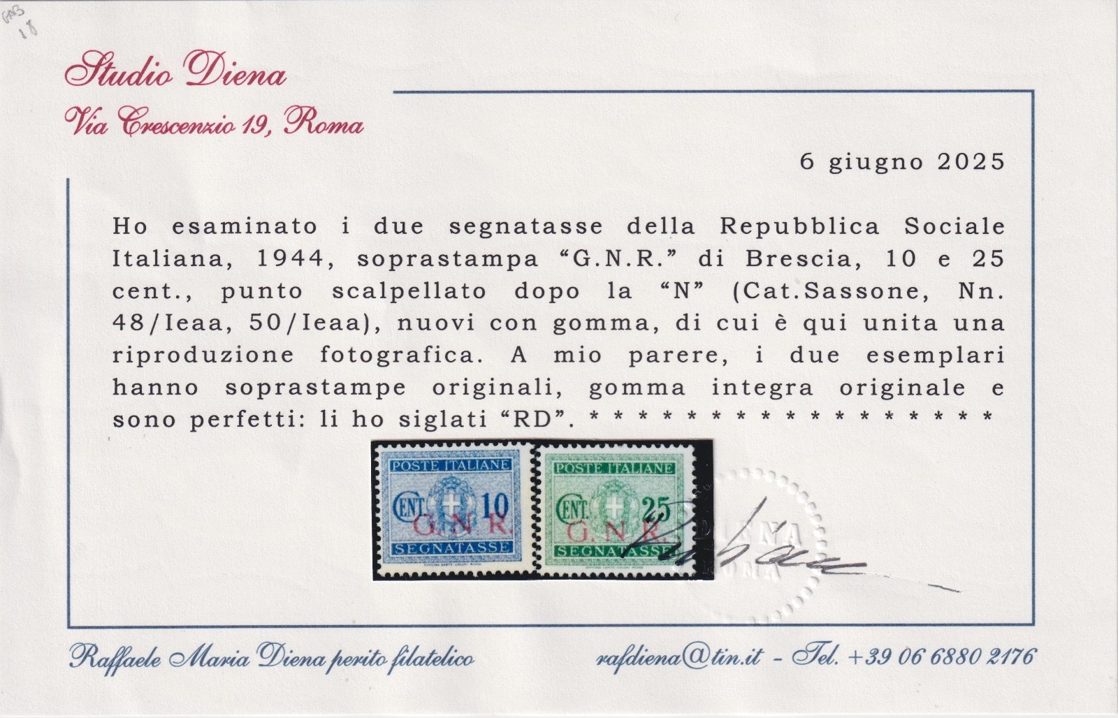 1944 SEGNATASSE REPUBBLICA SOCIALE ITALIANA G.N.R. MNH CERTIFICATO DIENA quantità