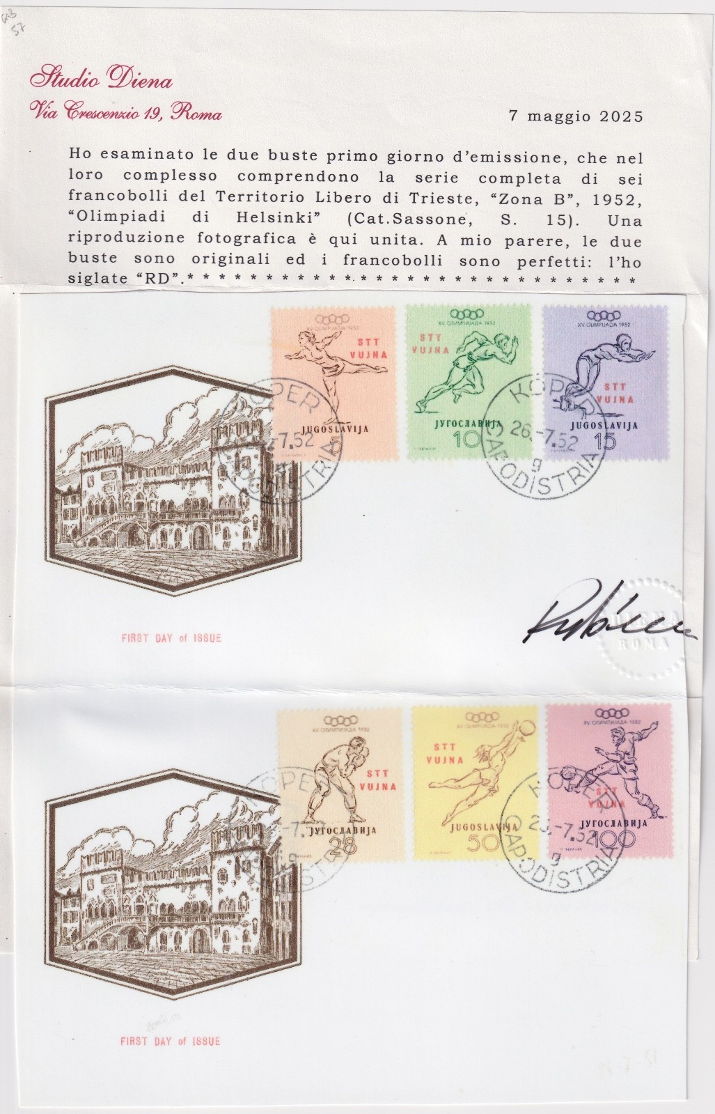 / 1952 TRIESTE ZONA B – 2 LETTERE OLIMPIADI DI HELSINKI – CERTIFICATE DIENA