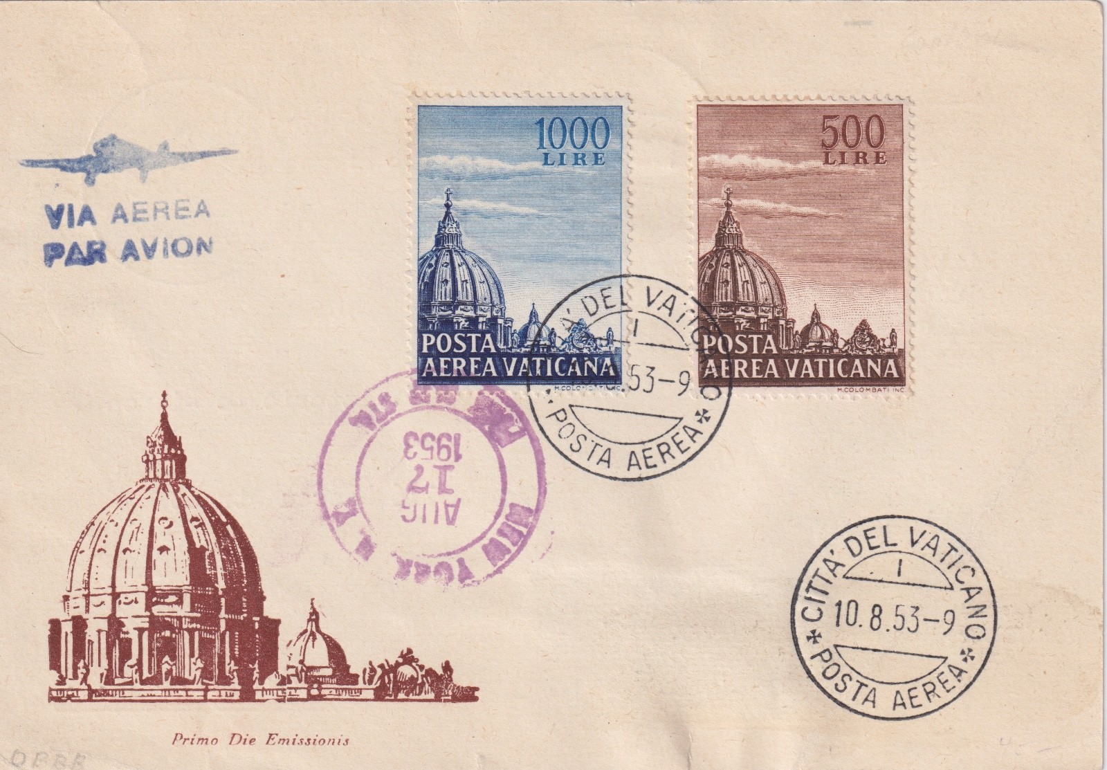 1953 VATICANO CUPOLONI POSTA AEREA ANNULLATO