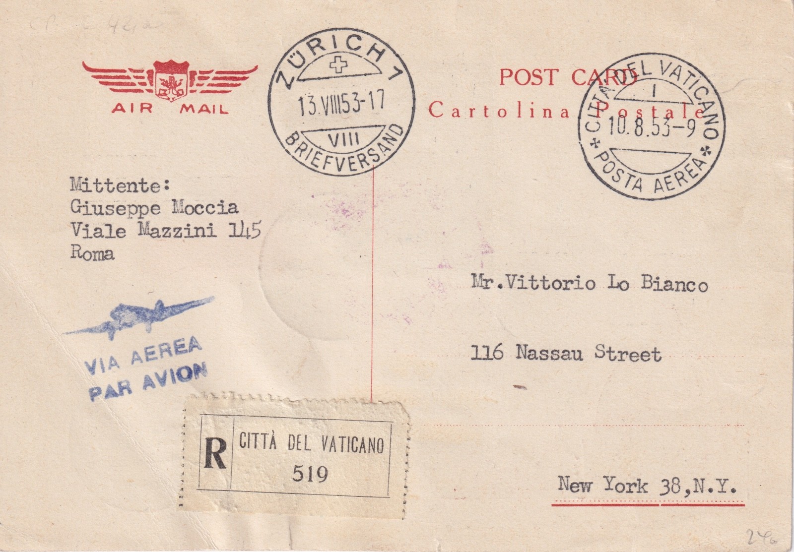 / 1953 VATICANO CUPOLONI POSTA AEREA ANNULLATO
