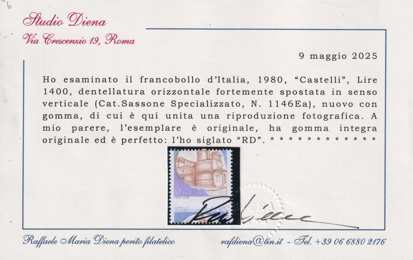 1980 CASTELLI D’ITALIA LIRE 1400 MNH CERTIFICATO DIENA