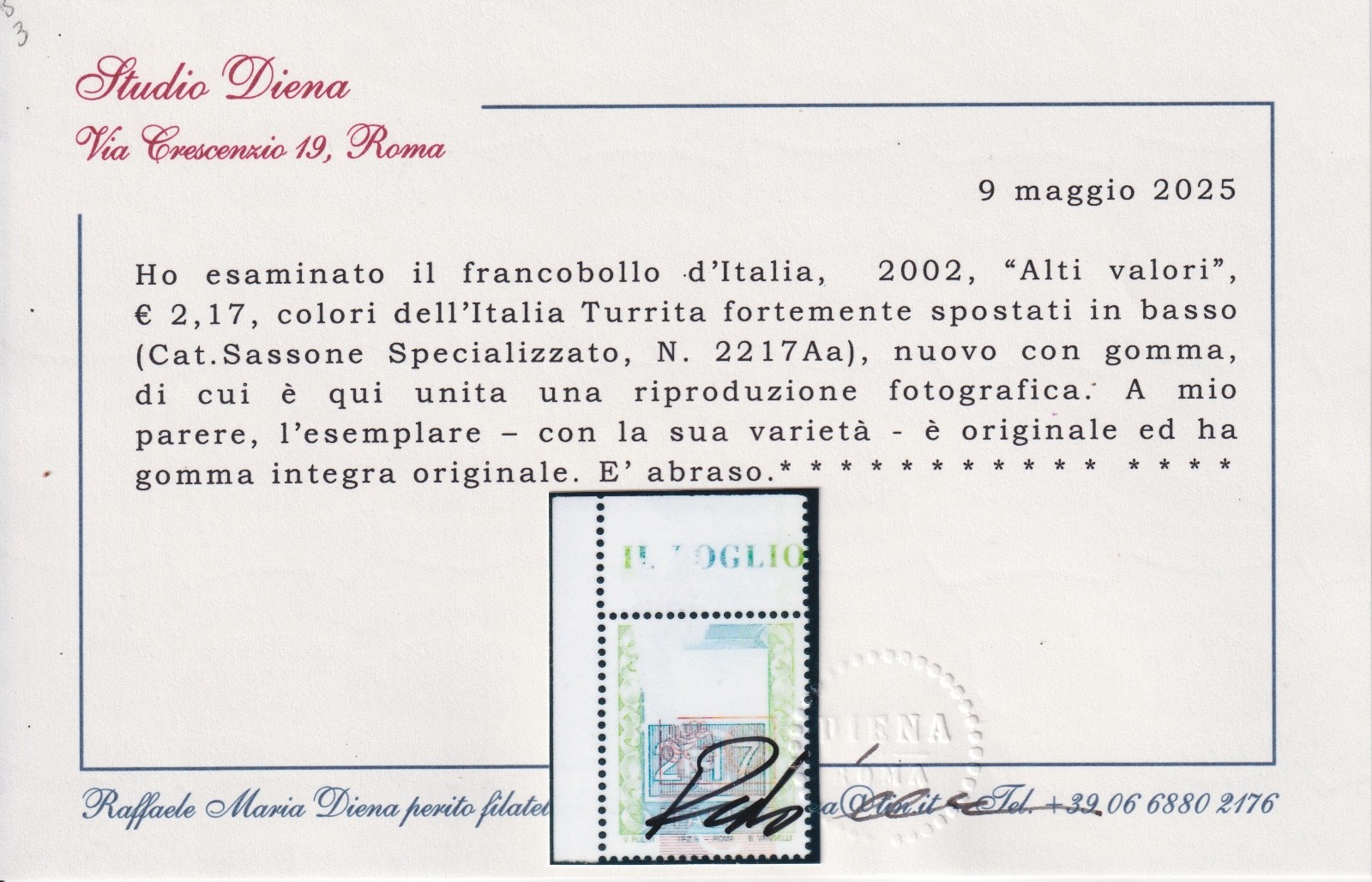 2002 ITALIA TURRITA “ALTI VALORI” MNH CERTIFICATO DIENA