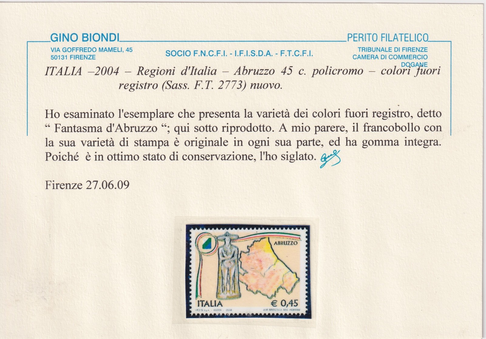 2004 ITALIA ABRUZZO 45c. POLICROMO MNH CERTIFICATO BIONDI quantità