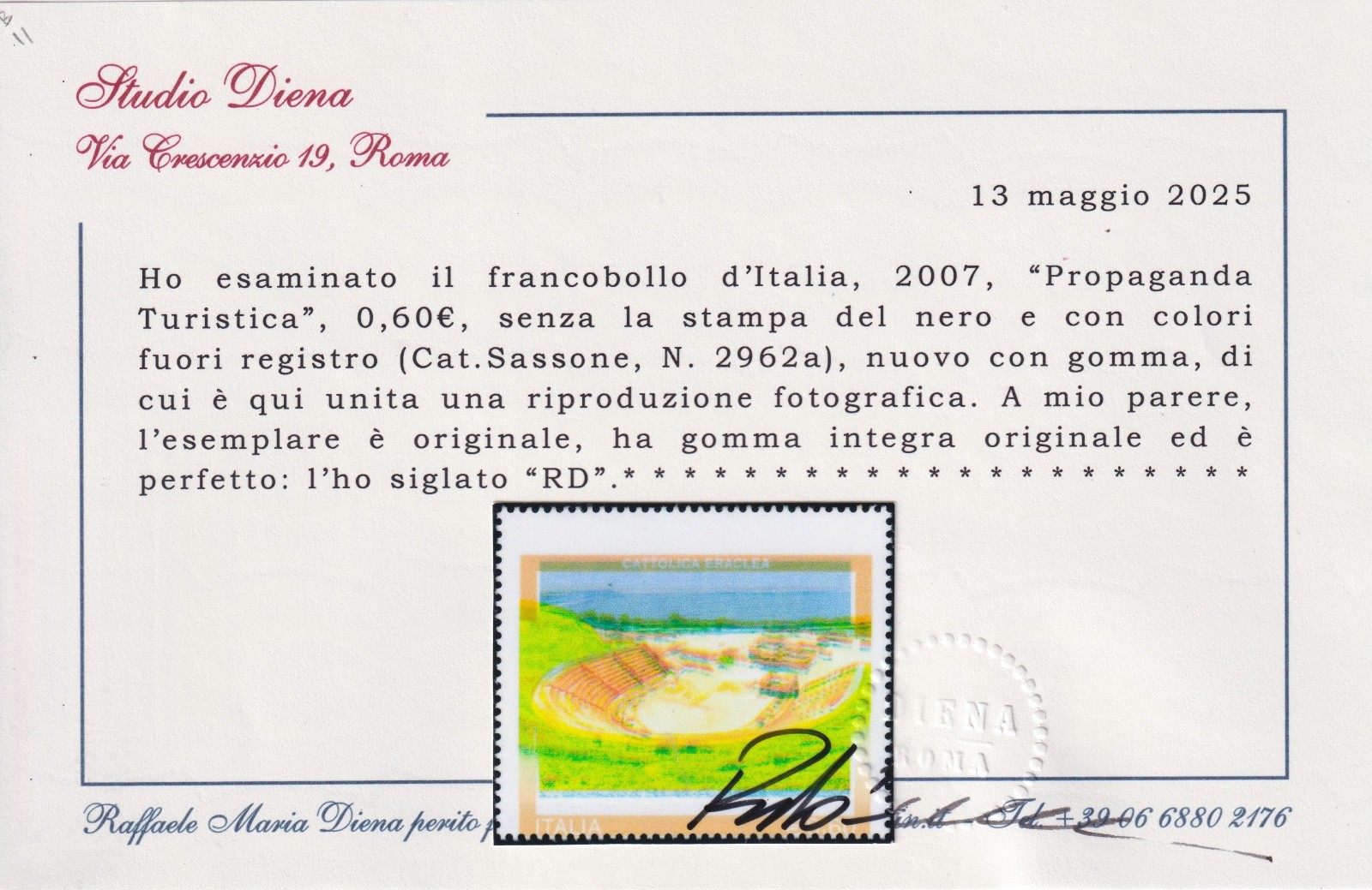 2007 ITALIA PROPAGANDA TURISTICA MNH CERTIFICATO DIENA