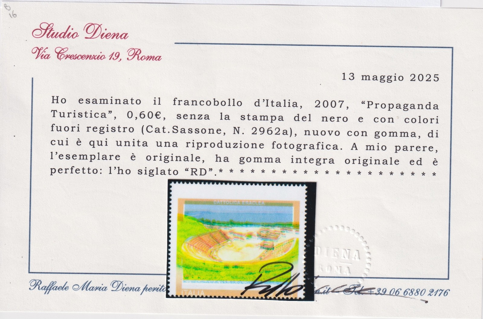 2007 ITALIA PROPAGANDA TURISTICA MNH CERTIFICATO DIENA