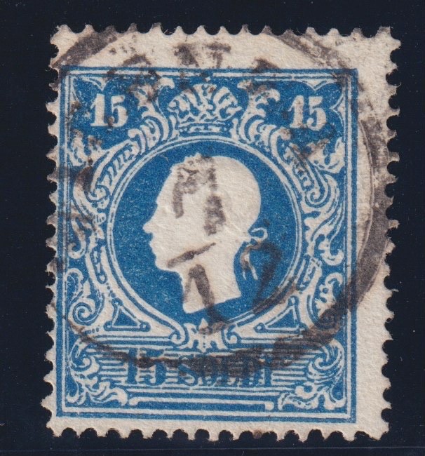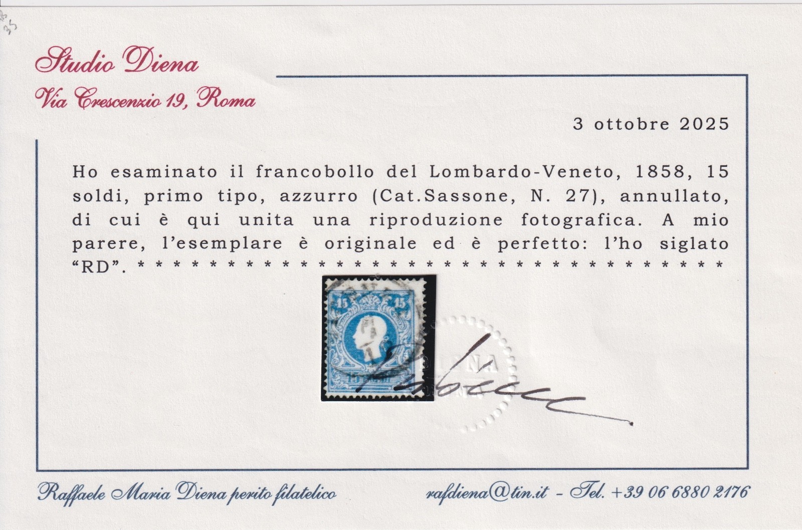 ANTICHI STATI – Lombardo Veneto – 1858 – 15 soldi azzurro CERT. DIENA