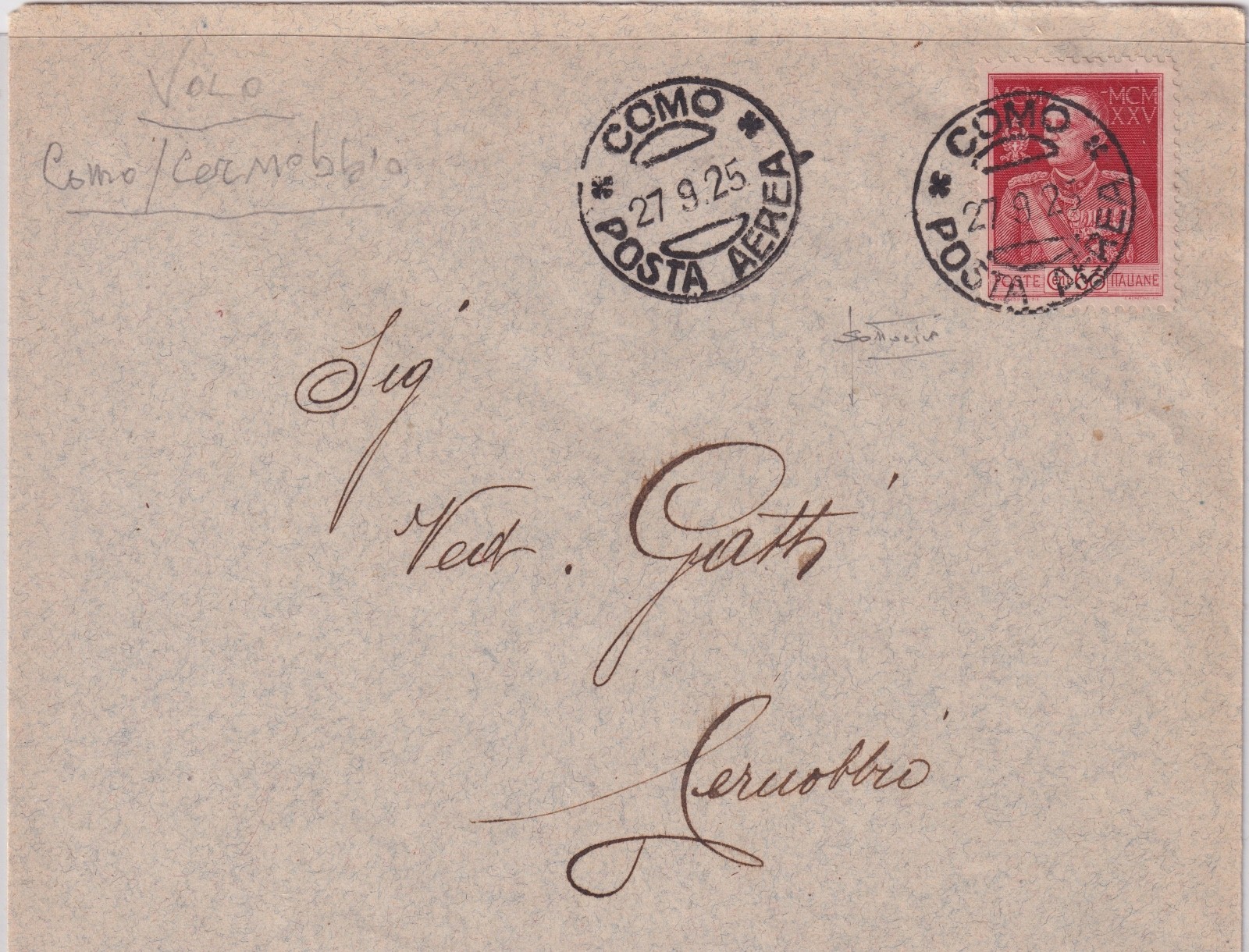 BUSTA SPEDITA PER VIA AEREA VOLO COMO – CERNOBBIO 1925 CERT. SOTTORIVA