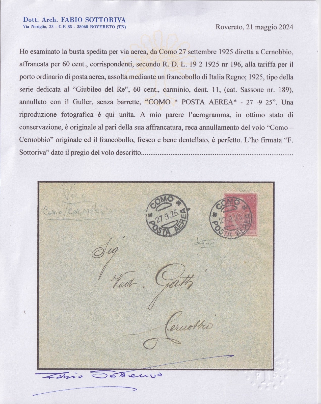 BUSTA SPEDITA PER VIA AEREA VOLO COMO - CERNOBBIO 1925 CERT. SOTTORIVA quantità