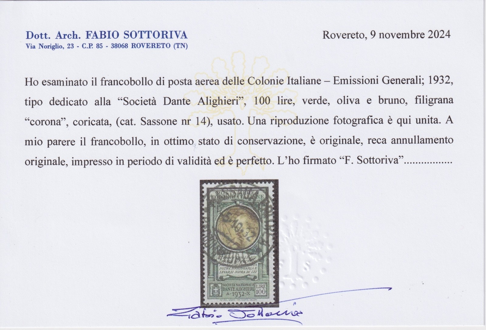 Colonie Emissioni Generali 1932 Dante Alighieri lire 100 cert. Sottoriva quantità