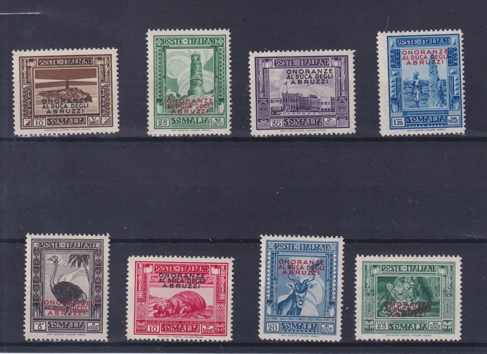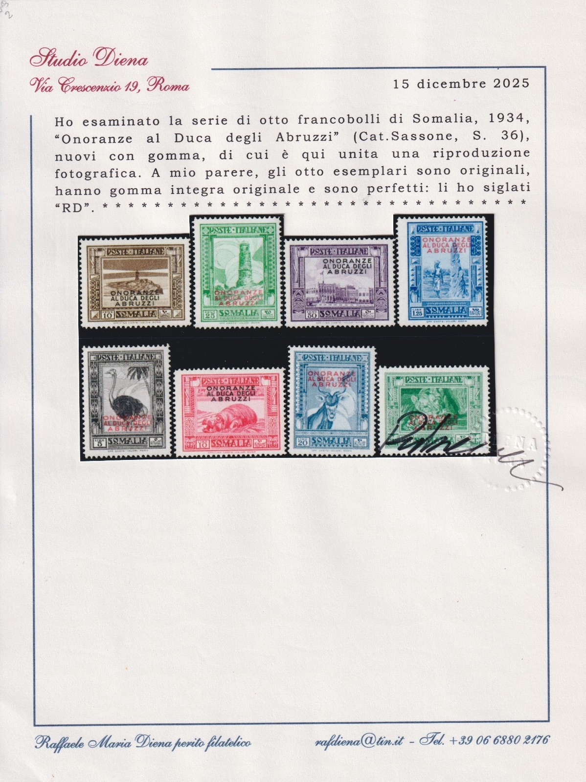 COLONIE SOMALIA 1934 ONORANZE AL DUCA DEGLI ABRUZZI 8 V. MNH CERT. DIENA quantità