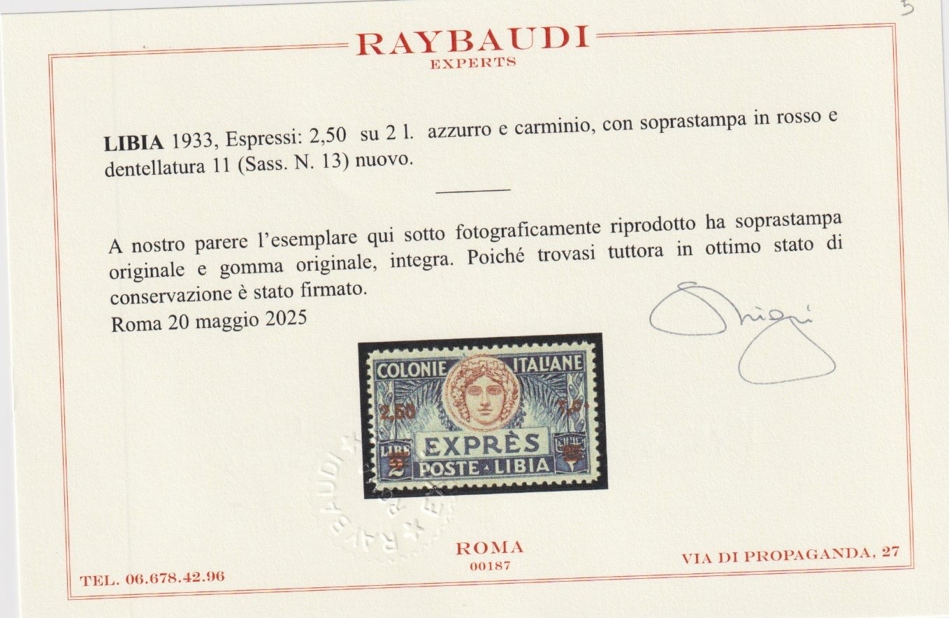 ESPRESSO LIBIA DENTELLATURA 11 1933 MNH CERTIFICATO RAYBAUDI quantità