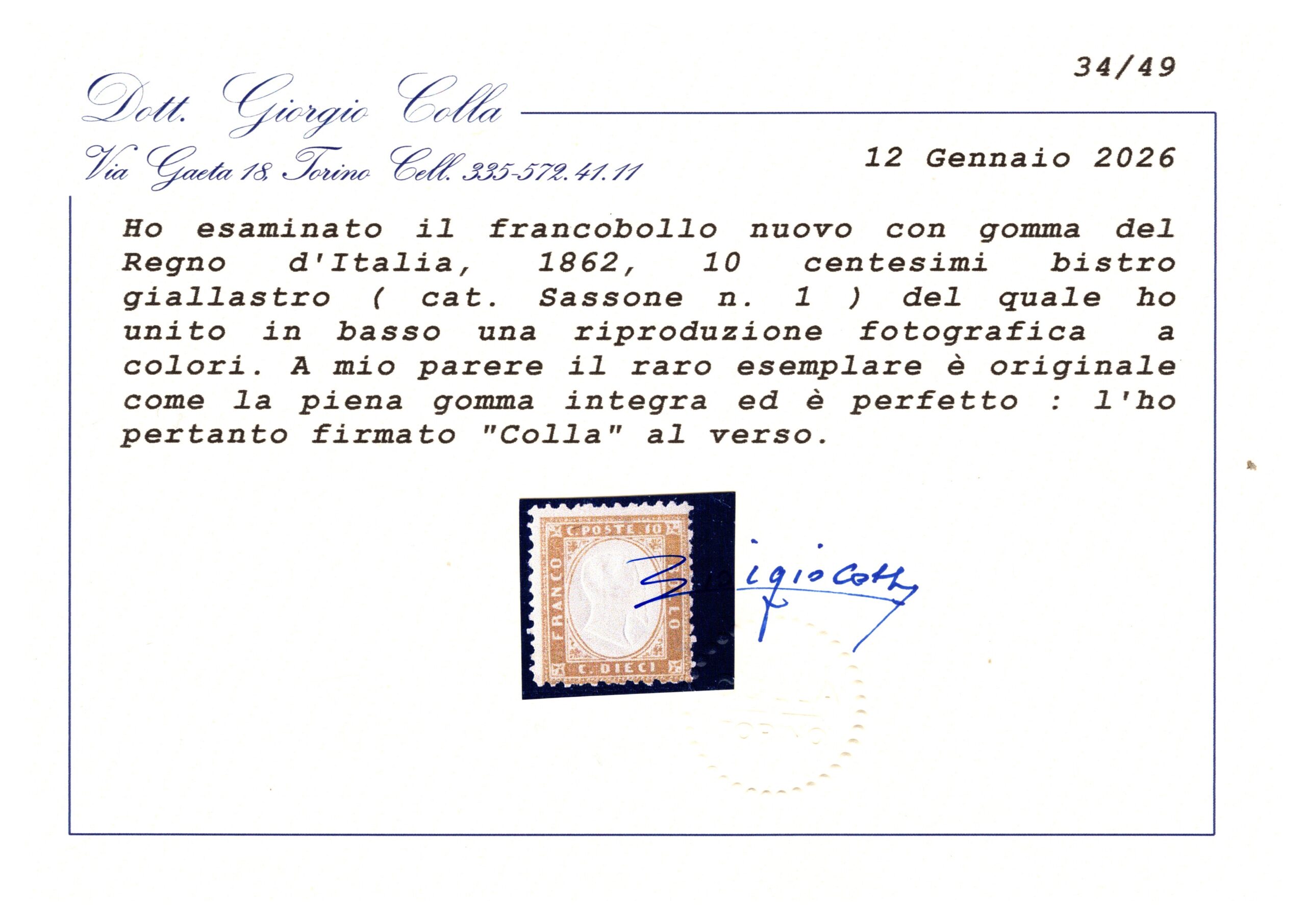 Francobollo regno d’alia numero 1 10 centesimi bistrò giallastro mnh cert. Colla
