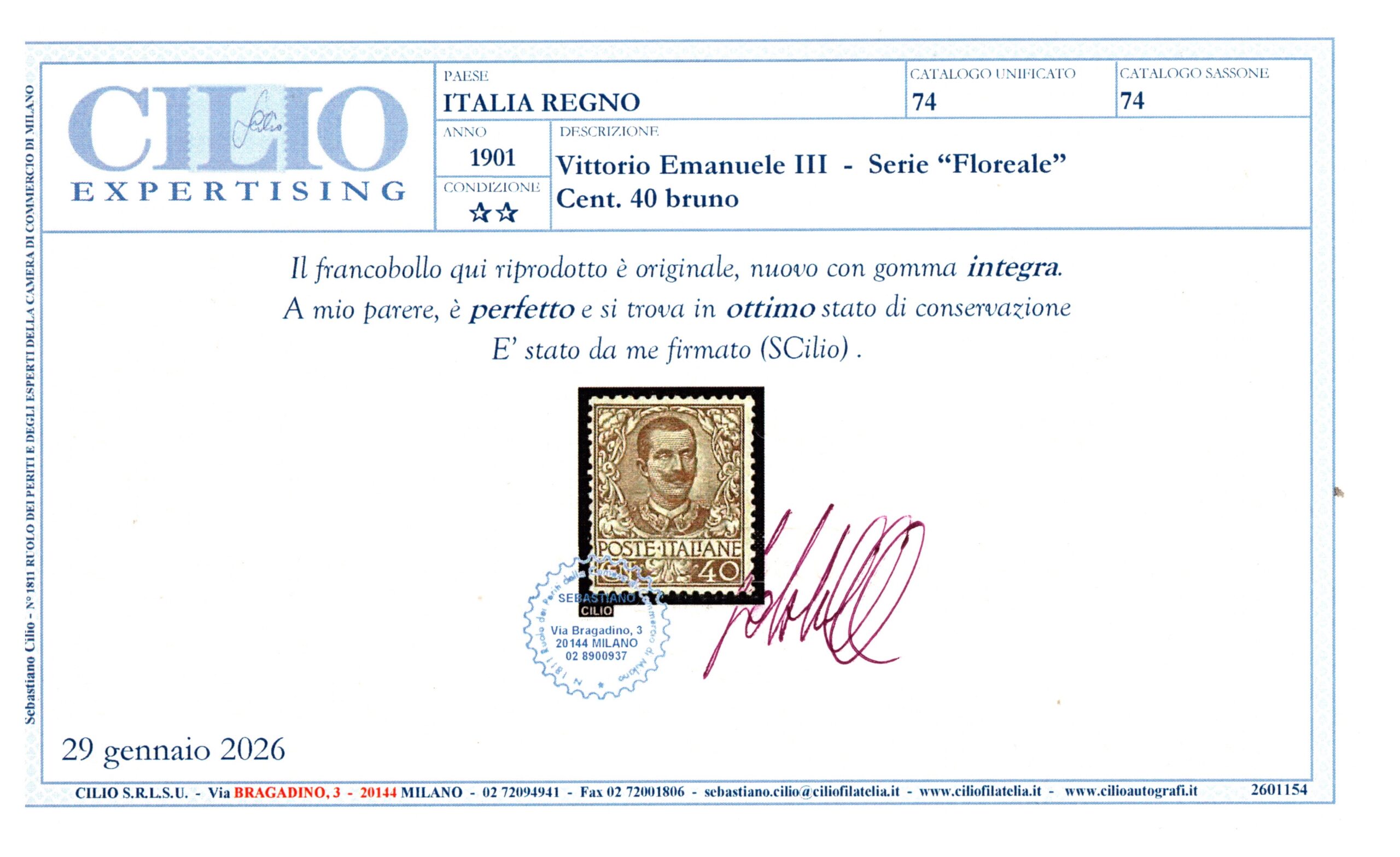 FRANCOBOLLO REGNO FLOREALE 40 C. MNH CERT. CILIO quantità