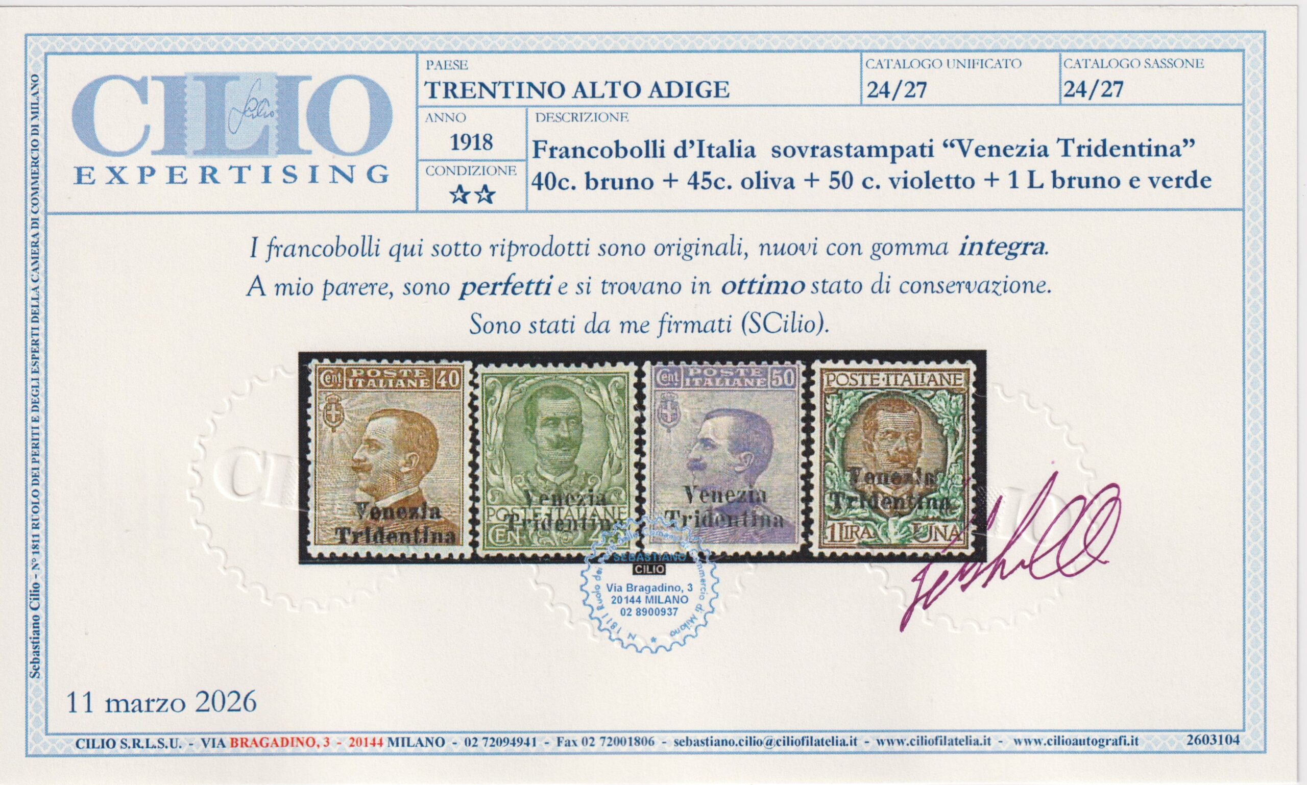 / ITALIA 1918 TRENTINO ALTO ADIGE “Venezia Tridentina” M.N.H. CERT. CILIO