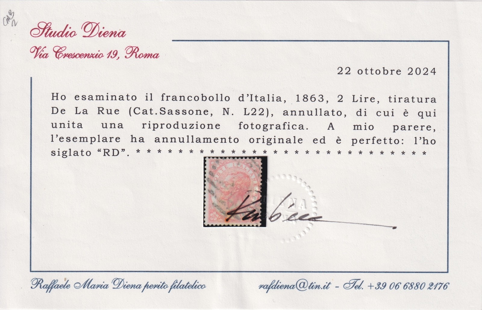 / Italia Regno 1863 Lire 2 Tiratura De La Rue L22 Certificato DIENA MNH